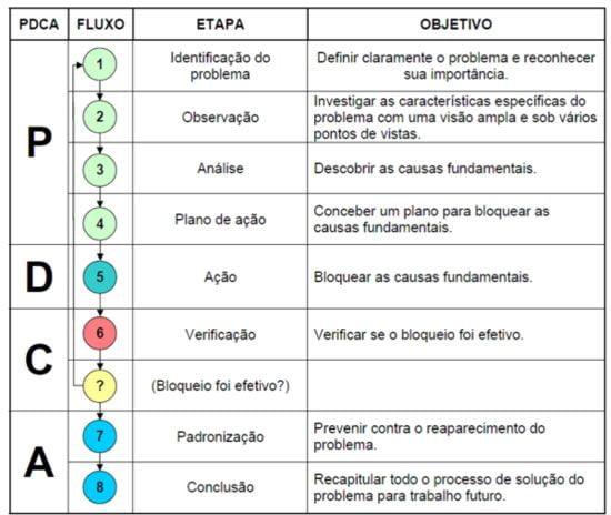 No quadro, é possível notar que cada fase do MASP está dentro de uma das etapas do ciclo PDCA, e que a ligação entre elas é baseada no que cada etapa representa dentro da lógica da melhoria contínua. Todas as etapas do MASPforam descritas no primeiro post sobre o assunto.